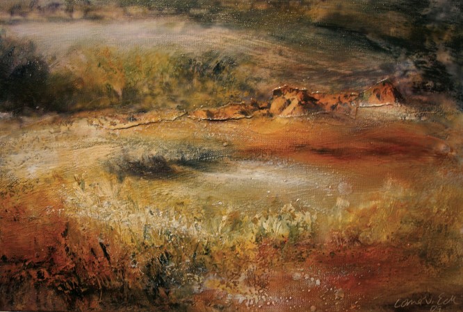 Corné van Eck transforms her landscape photographs into multi-media collages. She creates mindscapes by elaborating on portions of photographic material. Oils, combined with beeswax, bitumen, grass, bark and soil translates South African images into works of art. Each material is processed in such a way that they serve the composition as a whole.